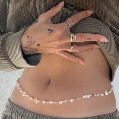 Un womb adornment, traduit littéralement par ornement d’utérus, est un bijoux composé de perles et de pierres semi-précieuses à porter pour prendre soin énergétiquement et émotionnellement de l’espace sacré qu’est notre ventre/utérus.