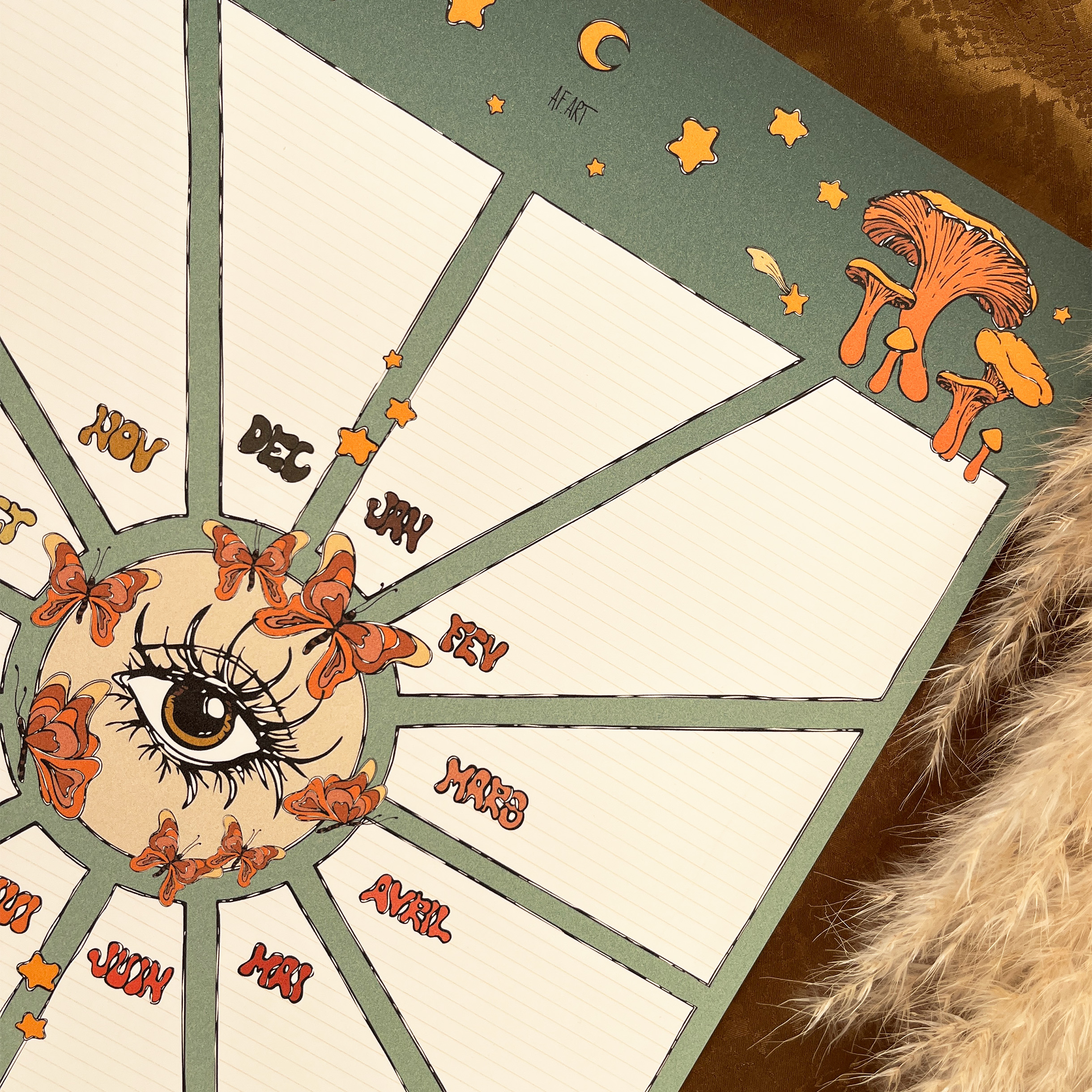 J’ai imaginé un calendrier qui se lit comme une horloge avec un design un peu 70s, disponible en deux coloris.
